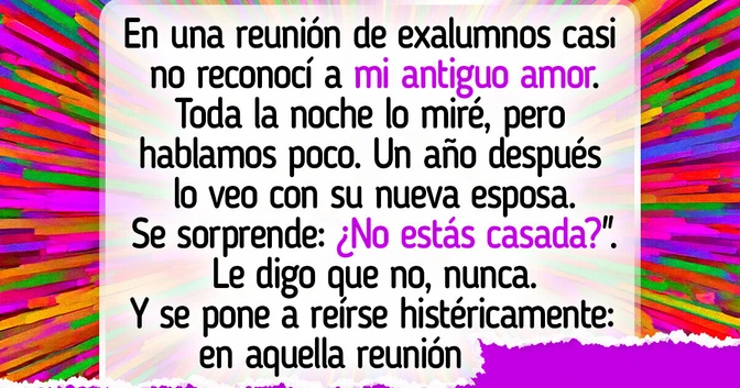- En una reunión de exalumnos, apenas reconocí a alguien de quien estaba perdidamente enamorada. No le quité los ojos de encima en toda la velada, pero apenas hablamos unas palabras. Un año después lo veo con su nueva esposa. Se sorprende: ¿No estás casada? ». Le digo que no, no lo he estado nunca. Y se pone a reírse histéricamente: resulta que en aquella reunión confundió mi mano izquierda, en la que llevaba un anillo, con la derecha (donde se lleva la alianza). Me amaba desde el instituto.