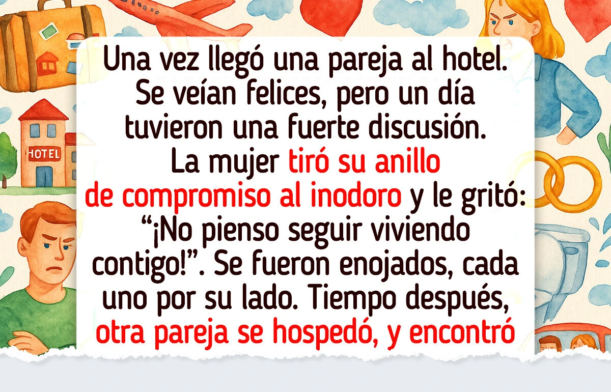 - Una vez llegaron al hotel una pareja. Se veían felices, pero un día tuvieron una fuerte discusión. La mujer tiró su anillo de casamiento al inodoro y le gritó: “¡No pienso seguir viviendo contigo!”. Se fueron enojados, cada uno por su lado. Tiempo después, otra pareja se hospedó en esa misma habitación, ¡y encontró el anillo en el inodoro! Fueron de inmediato a entregarlo en la recepción, preguntando si alguien lo había perdido. Los dueños supieron enseguida de qué se trataba, ya que conocían la historia de la pelea. Decidieron guardar el anillo, por si acaso… ¿Y adivinen qué? Al año siguiente regresó la misma pareja, pero esta vez con una hija pequeña. Los dueños del hotel les contaron lo ocurrido y les devolvieron el anillo. La pareja lo aceptó y ahora lo conservan como recuerdo de aquella antigua discusión.