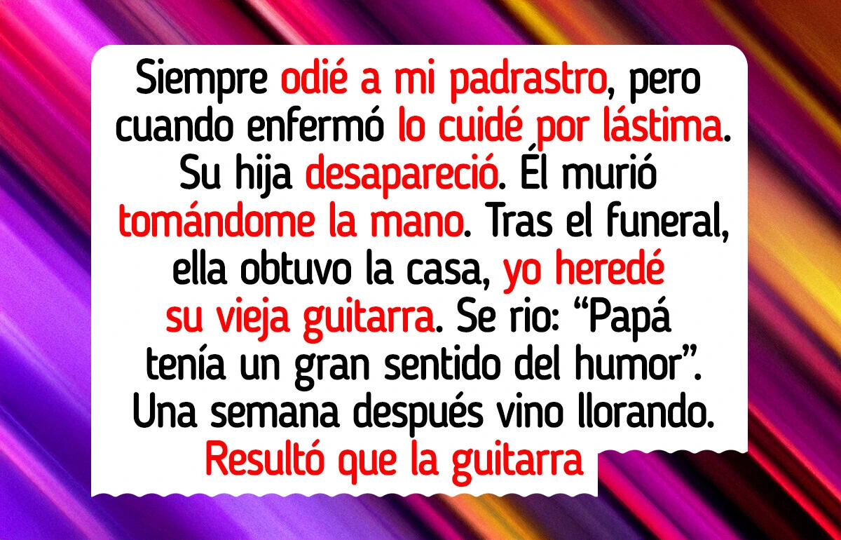 - Siempre odié a mi padrastro, pero cuando enfermó lo cuidé por lástima. Su hija desapareció. Él murió tomándome la mano. Tras el funeral, ella obtuvo la casa, yo heredé su vieja guitarra. Se rio de mí: “Papá tenía un gran sentido del humor”.