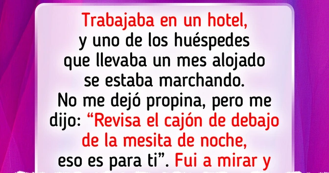 Habían esparcido pétalos de rosa y colocado decoraciones románticas por toda la habitación. Pero lo más inolvidable fue un cartel de un metro cuadrado pegado al techo, justo encima de la cama: una foto del padre de la novia, con una sonrisa exagerada y haciendo un gesto de “pulgar arriba”. © Unknown author / Reddit - Trabajaba en un hotel, y uno de los huéspedes que llevaba un mes alojado se estaba marchando. No me dejó propina, pero me dijo: “Revisa el cajón de debajo de la mesita de noche, eso es para ti”. Fui a mirar… y el cajón estaba lleno únicamente de monedas de diez y cinco centavos. Nada de billetes, ni monedas de veinticinco o de un centavo. Fue una de las cosas más raras que me ha tocado ver, pero eran unos 40 dólares. Así que, al final, no fue una mala propina. © DubsTx / Reddit
