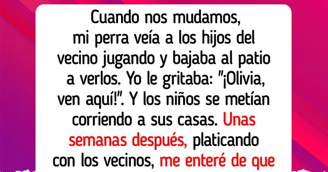 - Cuando nos mudamos por primera vez a nuestra casa, mi perra todavía estaba aprendiendo a comportarse. Veía a los dos niños del vecino jugando y bajaba al césped para observarlos. Yo le gritaba: “¡Olivia, ven aquí!” Y los niños salían corriendo del patio trasero y se metían a su casa. Pensé que simplemente le tenían mucho miedo a los perros. Unas semanas después, los vecinos estaban afuera arreglando su jardín y aproveché para presentarme y conversar un rato. Fue entonces cuando me enteré de que la niña también se llamaba Olivia. ¡Durante semanas, esos pobres niños creyeron que estaba intentando robármelos!