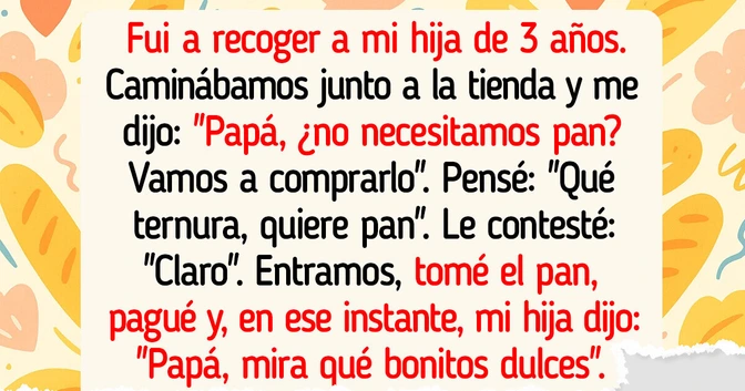 - Fui a recoger a mi hija, que tiene 3 añitos. Caminábamos junto a una tienda y me dice: “Papá, ¿necesitamos un pan? Vamos a comprarlo”. Pienso: “La niña quiere pan, qué ternura”. Le contesto: “Claro, vamos a comprarlo”. Entramos, tomo el pan, pago y, en ese instante, mi hija dice: “Papá, mira qué bonitos caramelos”.