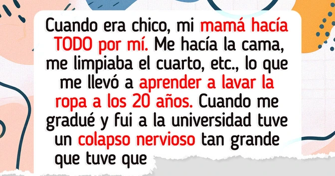 Cuando era chico, mi mamá hacía TODO por mí. Me hacía la cama, me lavaba la ropa, pagaba todo, me limpiaba el cuarto y me elegía la ropa hasta la secundaria. Nunca tuve que hacer tareas domésticas, lo que me llevó a aprender a lavar la ropa a los 20 años, no saber lavar los platos a mano y a tener mi cuarto siempre hecho un desastre. También me cuesta mucho ahorrar dinero porque nunca tuve que hacerlo, ya que a mis 23 años mi mamá todavía me paga todas las cuentas.