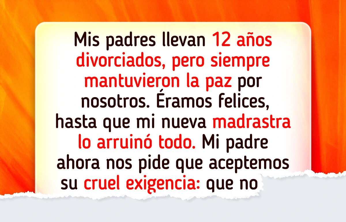 Cuando tenía 11 años, mi papá se volvió a casar. Su esposa no se lleva súper bien con nosotros, pero tampoco súper mal. Ella estaba incluida en las cosas con nuestros padres, como fiestas de cumpleaños, Navidad y esas cosas. Pero nunca fue muy amable con mi mamá y ahora mi hermano y yo descubrimos que ella no aprueba que mi papá y mi mamá hablen o estén en la misma habitación. No le gustan las celebraciones conjuntas de Navidad o las fiestas de cumpleaños. Ella cree que todo podría ser por separado. Y mi papá está pensando en hacerlo.