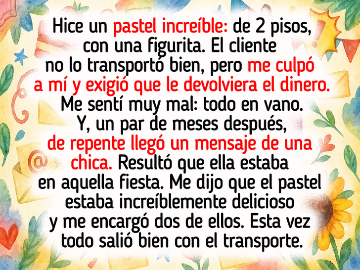 Hice un pastel increíble: de 2 pisos, con una figurita. El cliente no lo transportó bien, pero me culpó a mí y exigió que le devolviera el dinero. Me sentí muy mal: todo en vano. Y, un par de meses después, de repente llegó un mensaje de una chica. Resultó que ella estaba en aquella fiesta. Me dijo que el pastel estaba increíblemente delicioso y me encargó dos de ellos. Esta vez todo salió bien con el transporte.