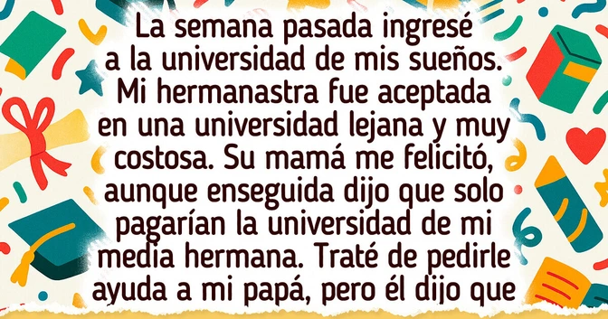 La semana pasada me aceptaron en la universidad de mis sueños. Estaba emocionada, porque me había esforzado mucho para lograrlo. Pero esa alegría no duró mucho, ya que mi hermanastra, que tiene mi misma edad, también fue admitida en una universidad costosa y lejana.