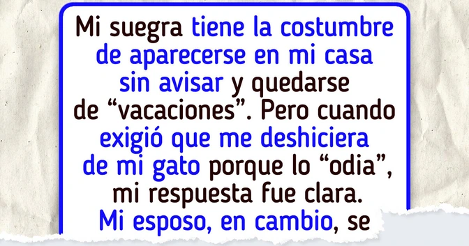 Tengo 38 años, soy ingeniera estructural y vivo con mi esposo y nuestro gato. Mi suegra apareció sin avisar este fin de semana, el viernes con su maleta, llamándolo vacaciones. Siempre odió que tenga un gato, pero este escenario fue inesperado.