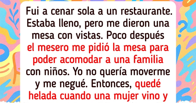 Eso fue exactamente lo que vivió la mujer de esta historia, quien desahogó en Reddit su frustración. En su relato cuenta cómo, tras llegar sola a un restaurante, buscando un momento de pausa, por poco es desplazada por una familia al que no encontraba espacio en el lugar. Lo que siguió después fue algo que no esperaba… y que todavía le cuesta poner en palabras.