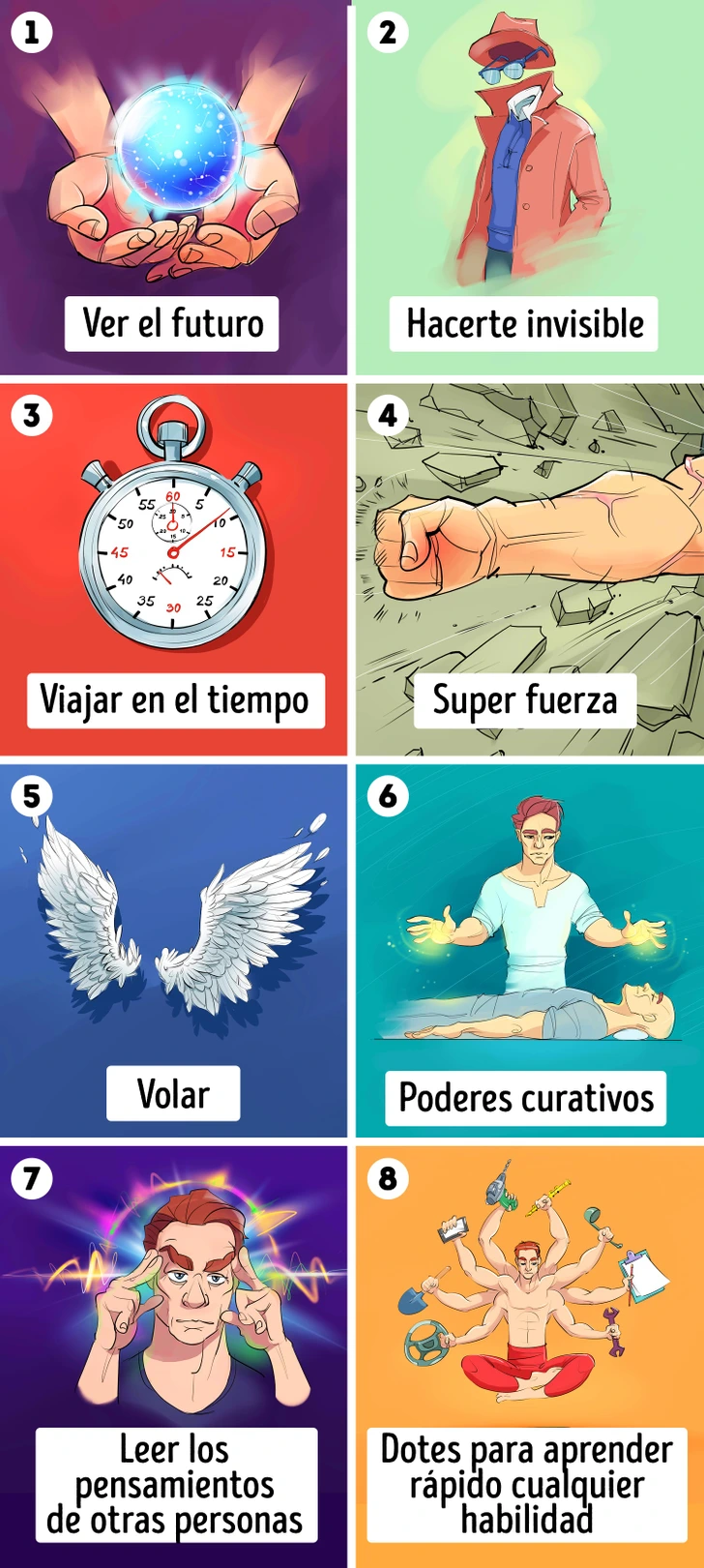 Genial.guru te propone fantasear e imaginar que frente a ti de repente aparece un mago. Él te dice que posee 7 superpoderes y puede darte algunos de ellos. Mira el dibujo de abajo y elige 2 superpoderes: